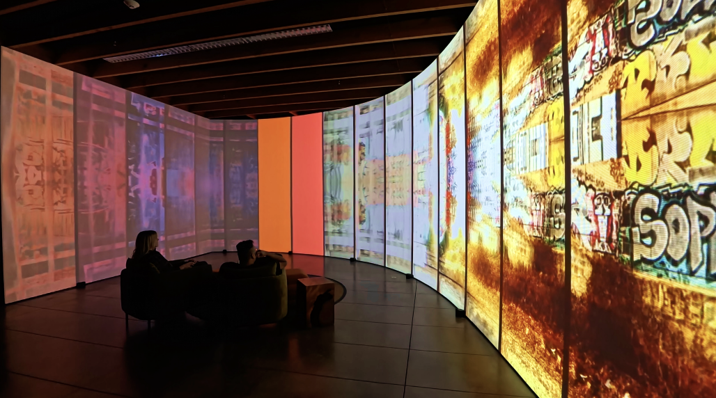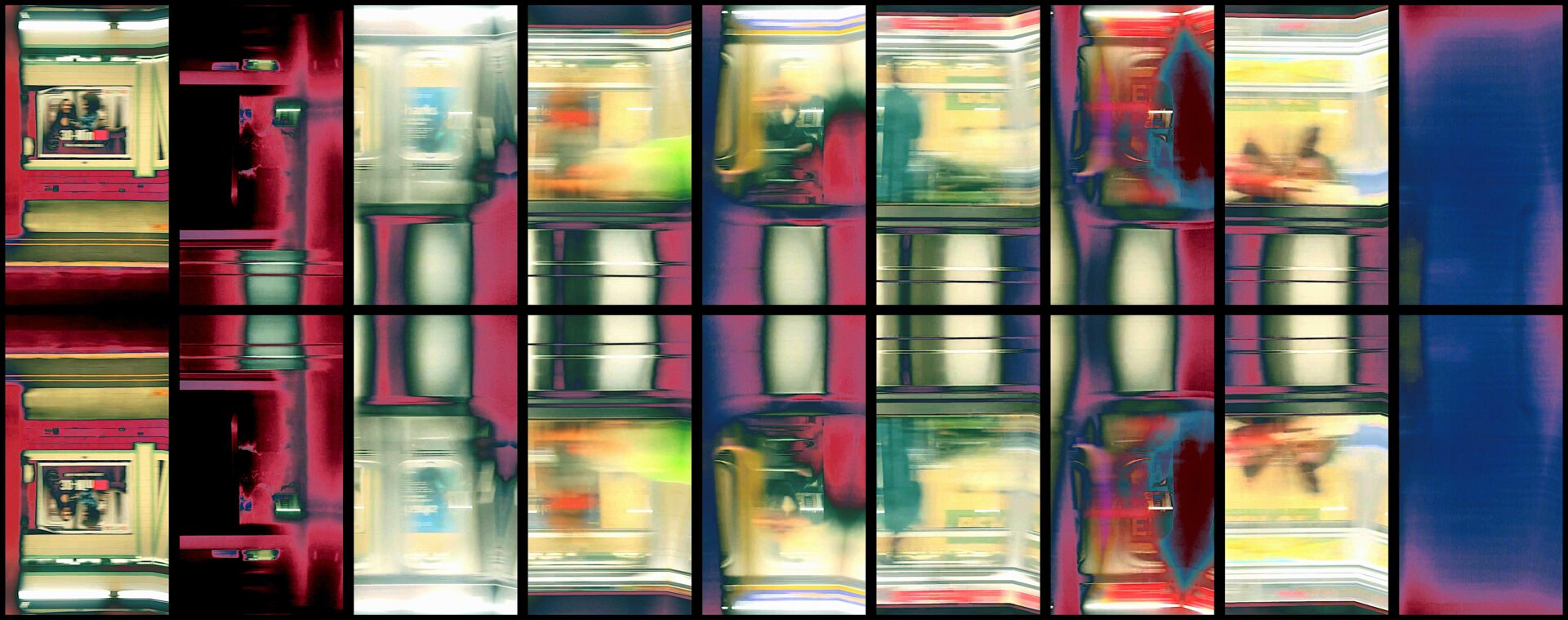 This installation recreates the hypnotic and transcendental states that often emerge from the repetitious visual, auditory, and haptic polyrhythms experienced aboard a moving train. Original portrait-mode footage is “temporally collaged” and spatially arranged to reconstruct views from rail-based public transportation in Barcelona, Budapest, Lisbon, Montreal and New York.